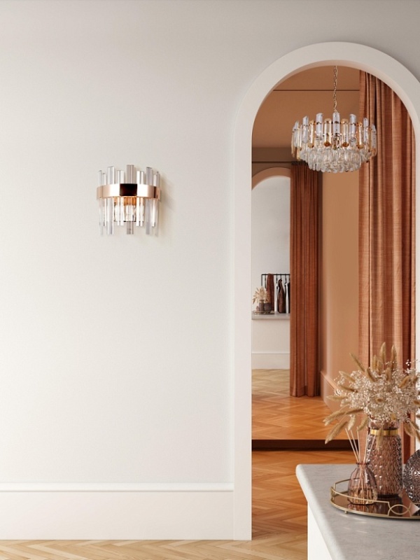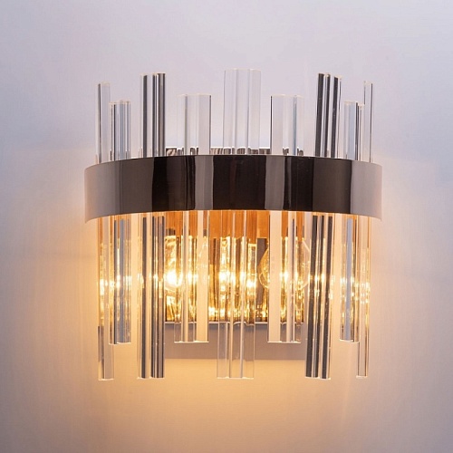 Металлическое основание гальванизировано в цвет золота. Светильник декорирован стеклянными элементами вытянутой формы.