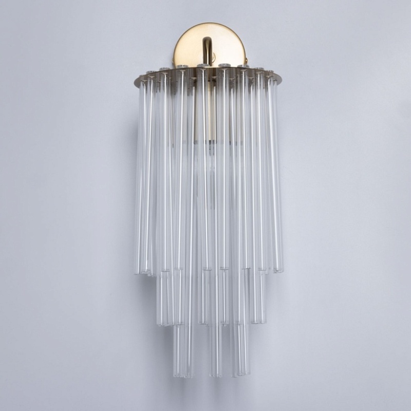 Металлическое основание настенного бра гальванизировано в цвет латуни. Светильник декорирован прозрачными стеклянными трубочками.