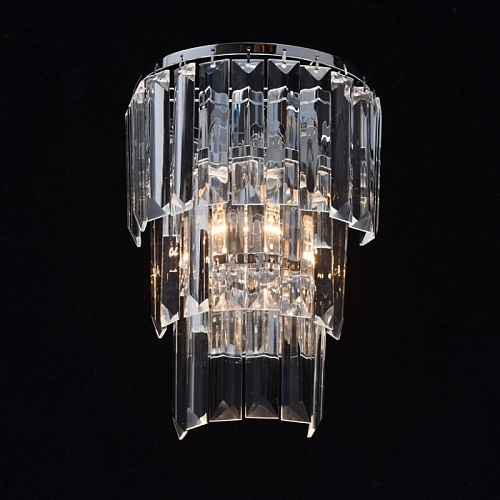 Основание бра выполнено из металла и гальванизировано в цвет хрома. Светильник декорирован прозрачным хрусталем прямоугольной формы.