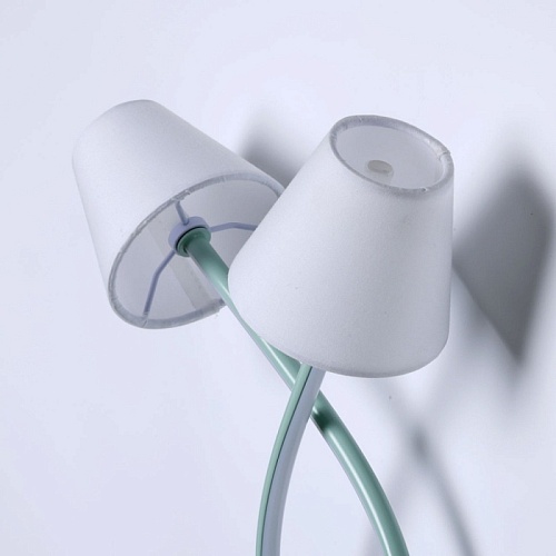 Металлическое основание настенного бра окрашено в зеленый цвет. Корпус плафонов изогнутой формы выполнен из сплава алюминия с цинком и окрашен в цвет основания. Двухслойные абажуры состоят из текстиля белого цвета и термостойкого акрила с внутренней стороны. Абажуры прошиты. Светодиодные источники света закрыты белым силиконом.