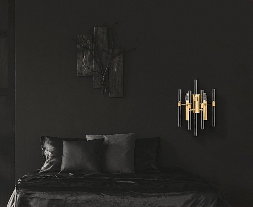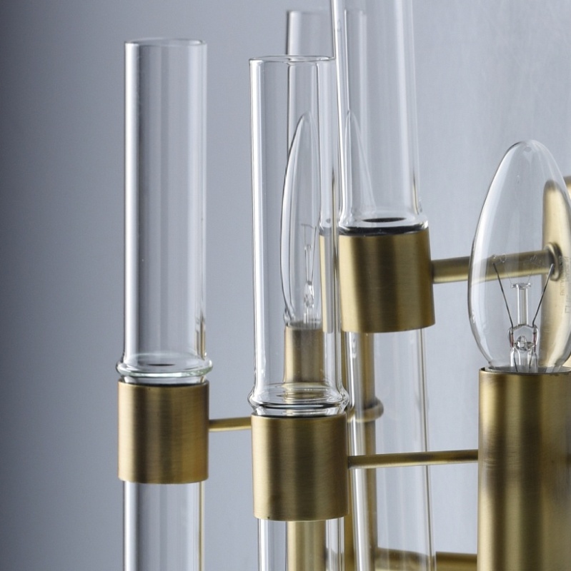 Основание бра выполнено из металла и гальванизировано в цвет латуни с патинированием. Декор в виде стеклянных полых трубок.