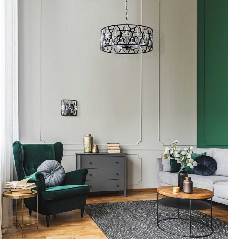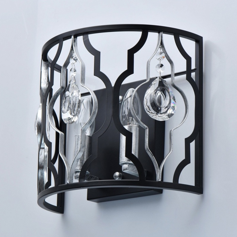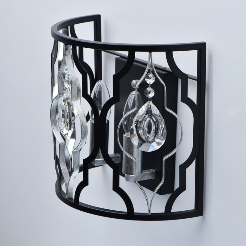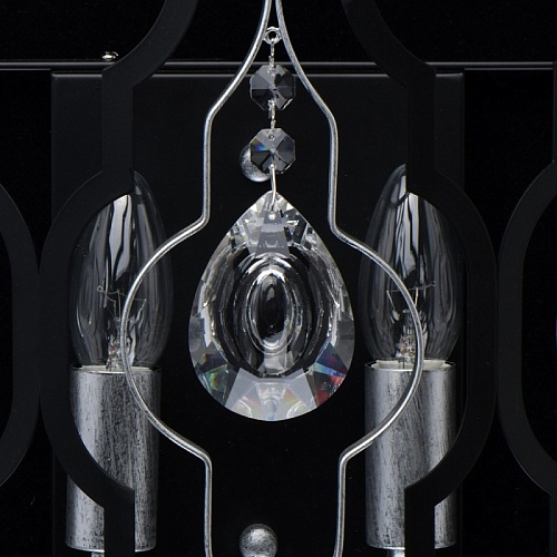 Основание светильника выполнено из металла и окрашено в черный цвет. Декоративные элементы на плафоне окрашены в цвет серебра. Декор из прозрачного хрусталя миндалевидной формы.