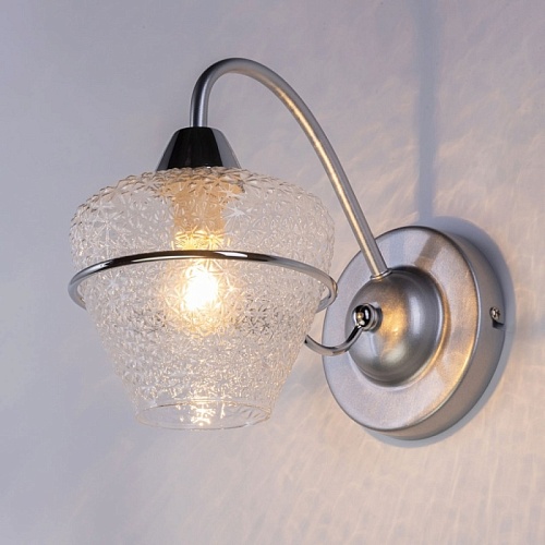 Металлическое основание настенного бра окрашено в серебряный цвет. Отдельные элементы основания гальванизированы в цвет хрома. Вертикальное настенное бра декорировано плафоном из фактурного стекла.
