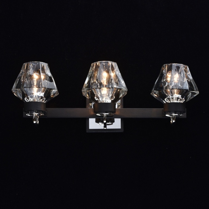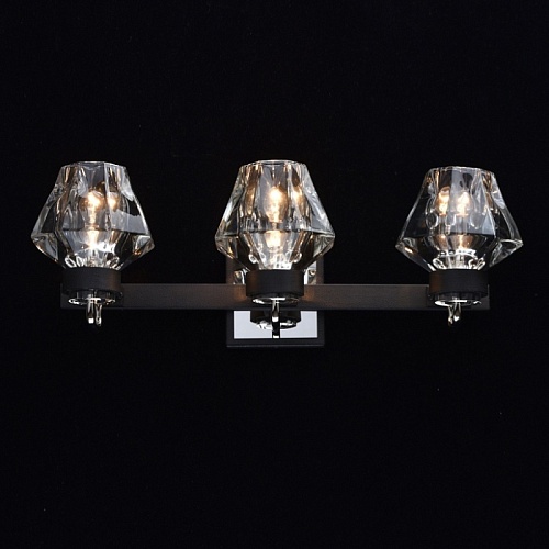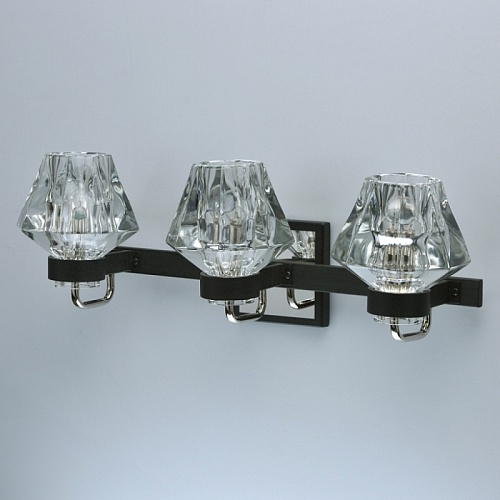 Основание бра выполнено из металла и обработано по технологии порошкового окрашивания с эффектом фактурной поверхности в черный матовый цвет. Держатели плафонов выполнены по технологии художественного литья. Рожки гальванизированы в цвет хрома. Плафоны отлиты из прозрачного стекла в сложную форму.
