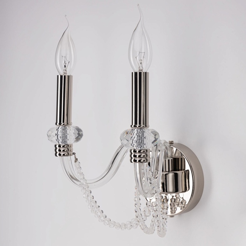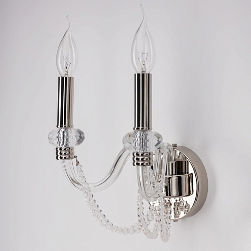 Металлическое основание настенного бра гальванизировано в цвет никеля. Рожки бра выполнены вручную из прозрачного выдувного стекла. Вертикальное бра декорировано прозрачными массивом хрусталя и хрустальными бусами.