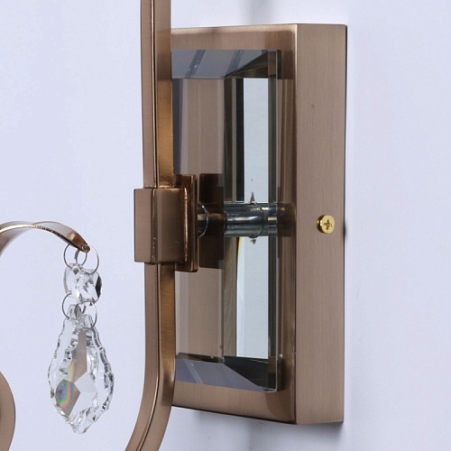 Металлическое основание настенного бра гальванизировано в цвет античной бронзы. Светильник декорирован прозрачным хрусталем формы дубовый лист.