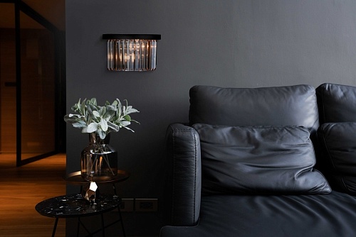 Основание бра выполнено из металла и окрашено в черный матовый цвет. Светильник декорирован хрусталем прямоугольной формы, гальванизированным в цвет шампань.
