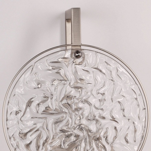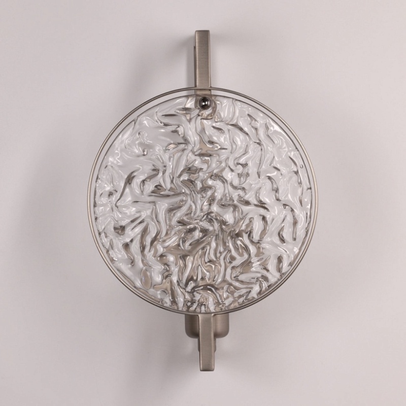 Металлическое основание настенного бра гальванизировано в цвет матового никеля. Декор выполнен из прозрачного фактурного стекла.