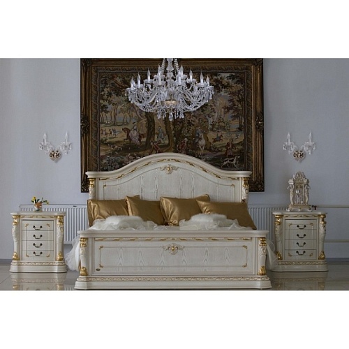 Арматура выполнена из сплава металла и гальванизирована в цвет французского золота. Рожки светильника выполнены из стекла гутным способом. Сверху арматура декорирована прозрачным хрустальным стеклом с градуированной огранкой. Светильник декорирован бусами из хрусталя и хрустальными подвесками 4-х видов огранки.