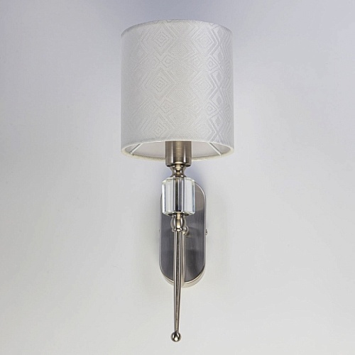 Металлическое основание настенного бра гальванизировано в цвет никеля, матировано. Двухслойный абажур белого цвета выполнен из текстиля и прозрачного термостойкого акрила. Бра декорировано прозрачным хрусталем.