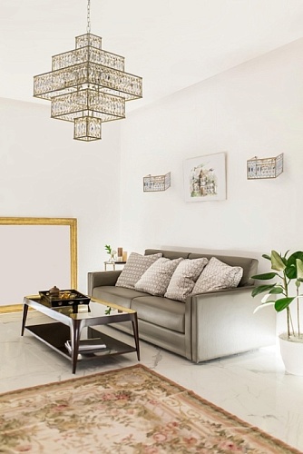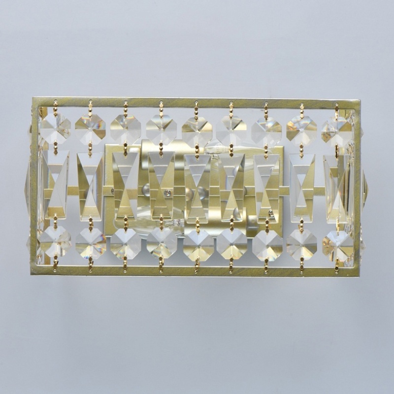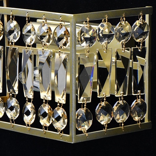 Основание светильника выполнено из металла и обработано по технологии хай-лайт, где основной слой цвета перламутрового золота, а декоративный слой цвета перламутрового серебра. Декор из хрусталя, гальванизированного в цвет шампань. Хрусталь прямоугольной формы и формы октагон