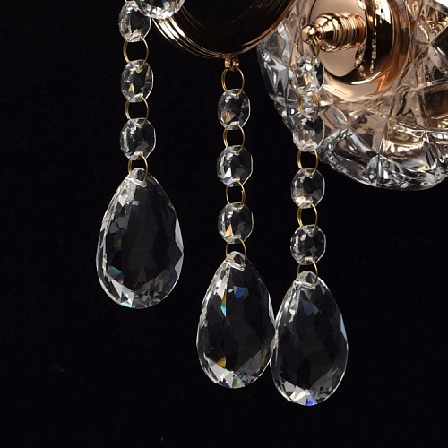 Арматура бра выполнена из стали и гальванизирована в цвет французского золота. Рожок профилирован и выполнен по технологии проката на роликовом станке. Декоративные розетки выполнены из стекла, отлитого в сложную форму. Светильник декорирован подвесками из хрусталя формы октагон и миндаль.