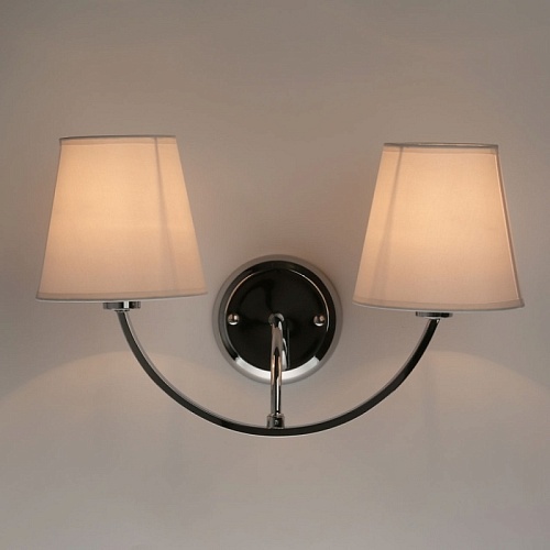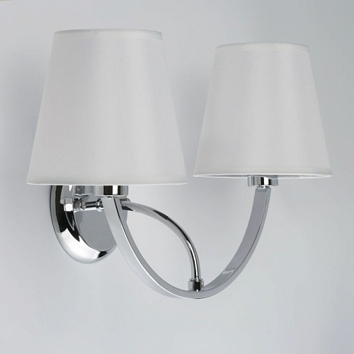 Металлическое основание настенного бра гальванизировано в цвет хрома. Вертикальное бра декорировано двухслойными текстильными абажурами белого цвета с термостойким акрилом внутри. Абажуры отделаны кантами сверху и снизу и прошиты.