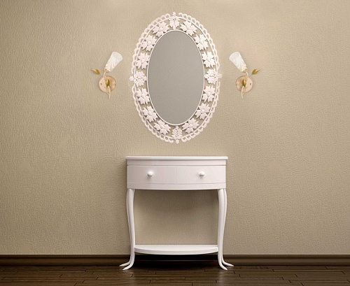 Основание: металл, окрашивание по технологии хай-лайт, основной цвет - белый, декоративный слой цвета золота. Рожок выполнен по технологии проката на роликовом станке. Плафон: стекло отлитое в форму, матирование, ручное окрашивание по поверхности.Декор: растительные элементы из металла, окрашивание в салатовый цвет.