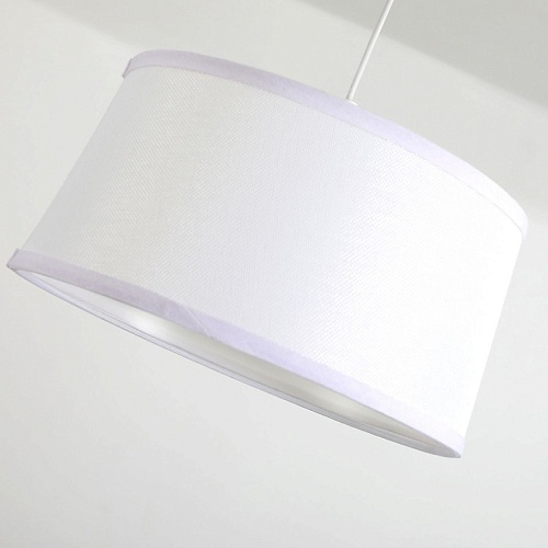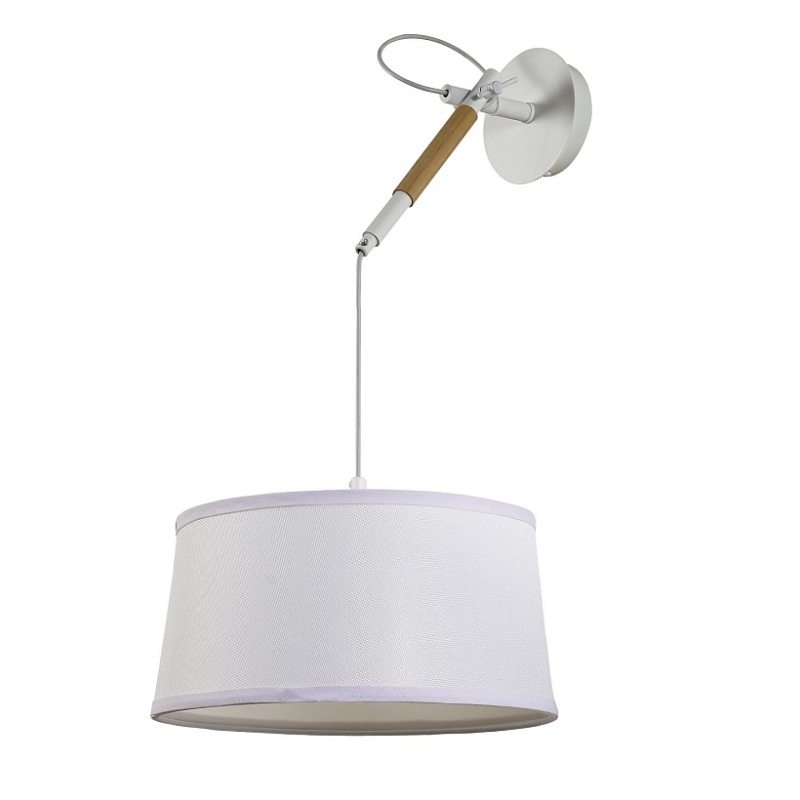 Металлический каркас белого цвета со вставкой под цвет дерева, плафон из кремовой ткани, светильник можно монтировать как на потолок, так и на стену.