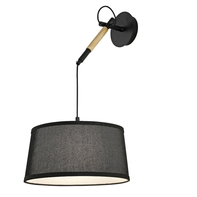 Металлический каркас черного цвета со вставкой под цвет дерева, плафон из черной ткани, светильник можно монтировать как на потолок, так и на стену.