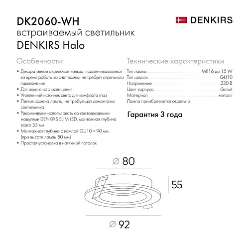 Характеристики DK2060-WH Встраиваемый светильникIP 20, до 15 Вт, GU10, LED, белый, алюминий