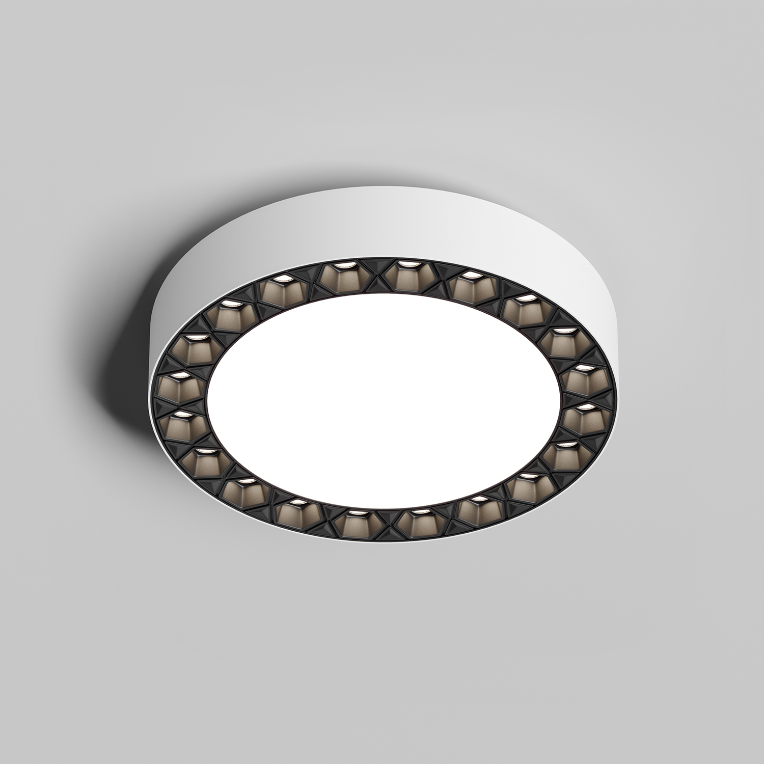 Dual - серия накладных потолочных светильников для основного освещения. Светильники данной серии имеют 2 зоны освещения:\n - центральная область, светодиоды которой расположены за рассеивателем из матового акрила;\n - радиальная область, светодиоды которой расположены по краям светильника в шестиугольных сотах.\nМожет применяться как в коммерческих помещениях, так и в жилых. Конструкция линзы в форме шестиугольника с антибликовым покрытием создает максимальный антибликовый эффект. Светильники данной серии имеют очень легкую систему установки.\nДрайвер светильника оснащен пошаговым блоком управления. Это устройство позволяет менять режимы работы светильника путем его включения и выключения при помощи обычного выключателя. При первом включении всегда включается матовая центральная часть. При этом, если повторно включить и выключить светильник в течении 10 секунд, произойдет смена режима - загорятся светодиоды по периметру, а затем, при повторном выключении и включении в течении 10 секунд, начнут светиться оба блока светодиодов в центре и по периметру. Включение с интервалом более 10 секунд всегда включает светильник в режиме свечения центральной части. Срок гарантии 3 года.