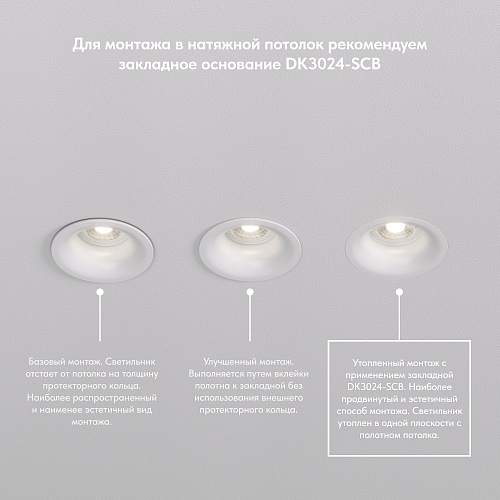 Встраиваемый светильник Denkirs DK3024 WH изготавливается в корпусе из прочного термостойкого полимера. Его минималистичный дизайн с аккуратными линиями и матовой поверхностью делает его универсальным решением для любого интерьера. Белый цвет корпуса гармонично сочетается с различными цветами и текстурами, придает пространству легкость и свежесть.\nСветильник оснащен цоколем GU5.3, что позволяет использовать лампы мощностью до 10 Вт. Полимерный корпус обеспечивает долговечность и надежность изделия. Светильник идеально подходит для создания направленного освещения, акцентов на нужных зонах.\nМодель будет отлично смотреться в современных интерьерах, таких как минимализм, скандинавский стиль или хай-тек. Он добавит освещения, подчеркнет стиль и утонченность вашего пространства. Срок гарантии 3 года.