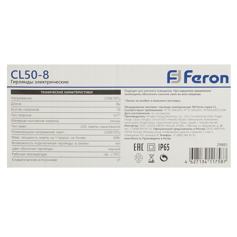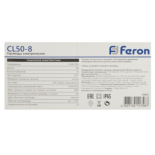 Характеристики Гирлянда Feron CL50-8 Белт-лайт 230V черный IP65 8м