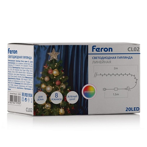 Характеристики Светодиодная гирлянда Feron CL02 линейная 2м +1.5м 230V мультиколор, c питанием от сети, с контроллером, зеленый шнур
