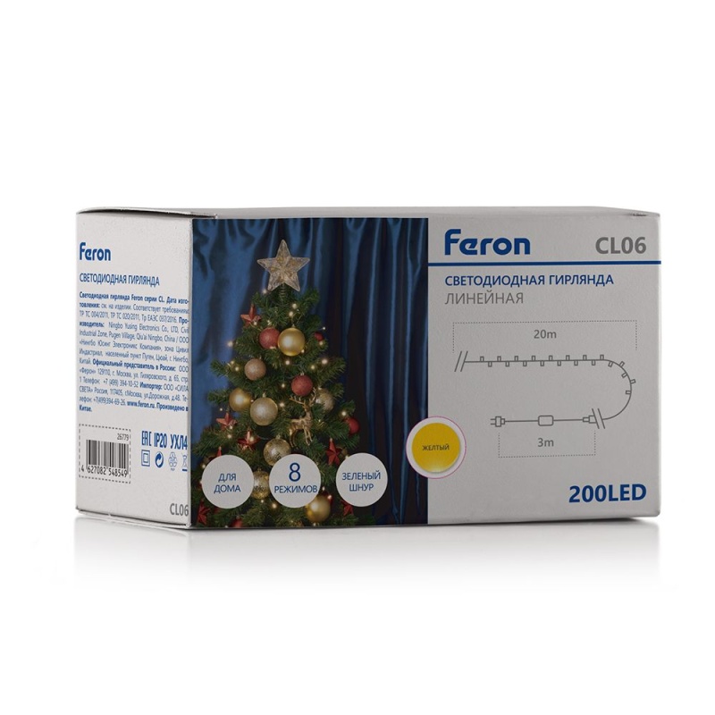 Характеристики Светодиодная гирлянда Feron CL06 линейная 230V желтый c питанием от сети, контроллером, зеленый шнур