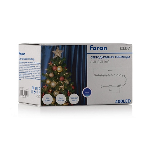 Характеристики Светодиодная гирлянда Feron CL07 линейная 40м +3м 230V синий, c питанием от сети, зеленый шнур