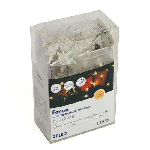 Характеристики Светодиодная гирлянда Feron CL589 линейная Звездочки на проволоке, 2700К, с питанием от батареек, прозрачный шнур 2.3м