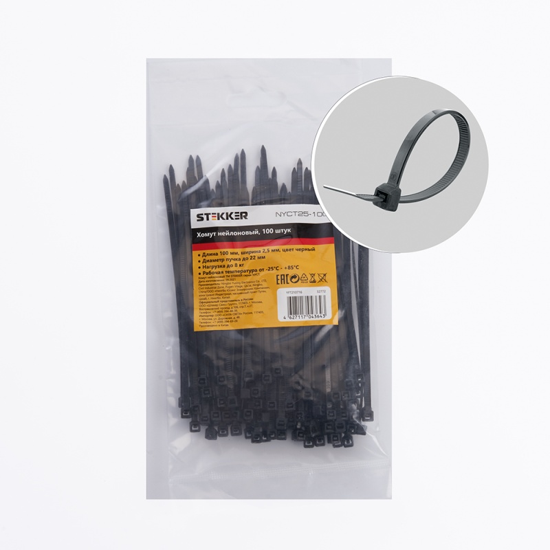 Характеристики Хомут нейлоновый STEKKER NYCT25-100 2,5x100 мм, d пучка max 22 мм, нагрузка 8 кг, черный, упаковка 100 шт.