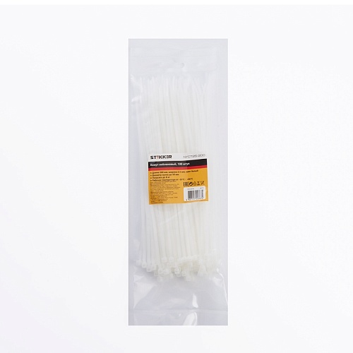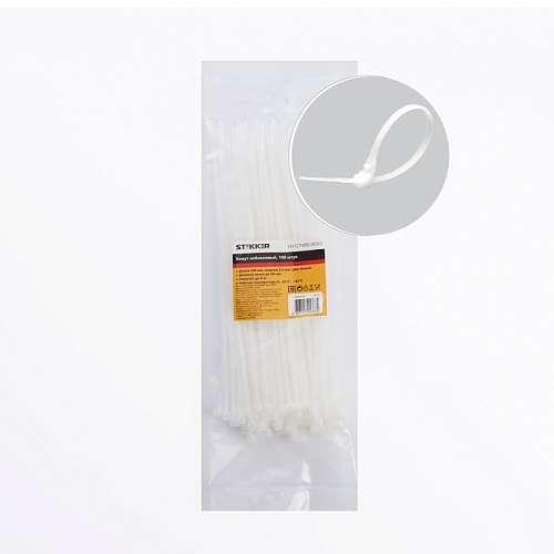 Характеристики Хомут нейлоновый STEKKER NYCT25-200 2,5x200 мм, d пучка max 50 мм, нагрузка 8 кг, белый, упаковка 100 шт