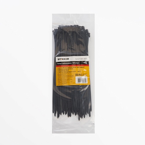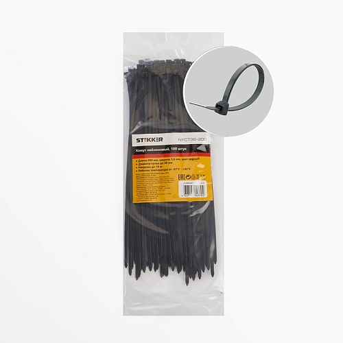 Характеристики Хомут нейлоновый STEKKER NYCT36-200 3,6x200 мм, d пучка max 50 мм, нагрузка 18 кг, белый, упаковка 100 шт