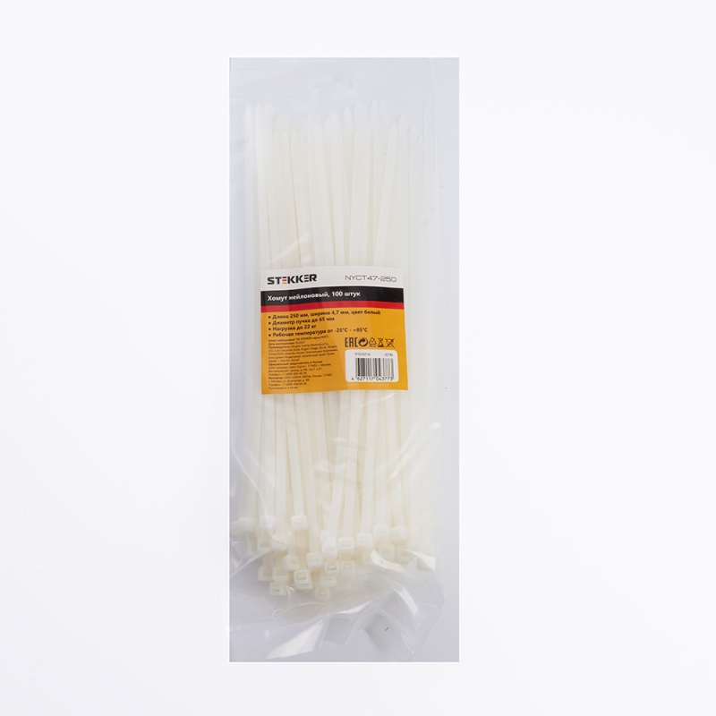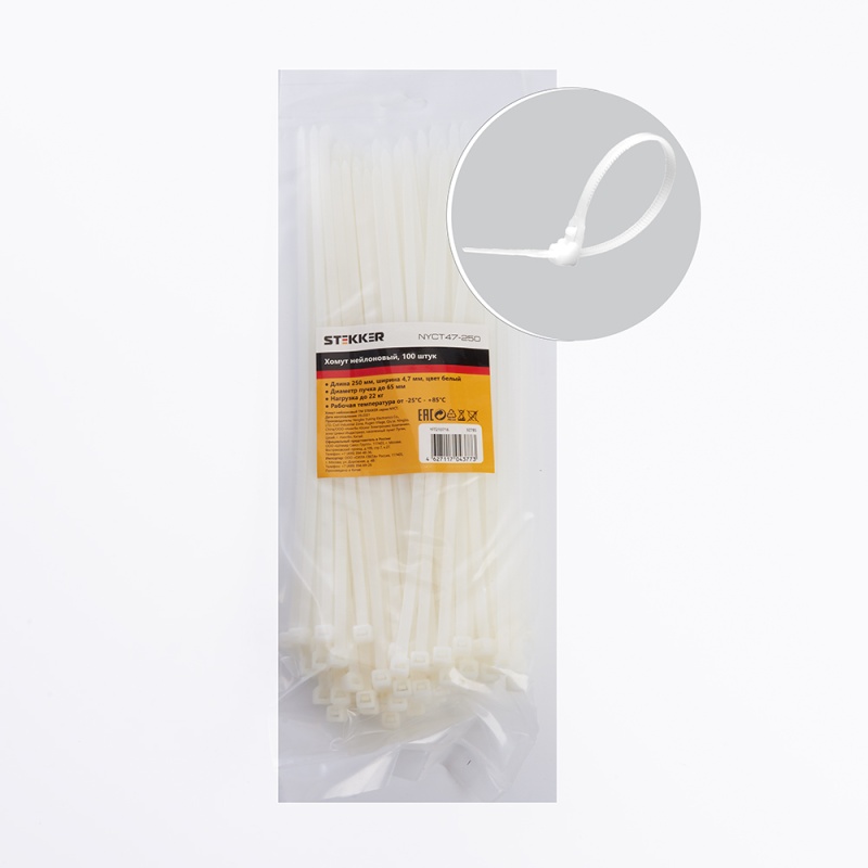 Характеристики Хомут нейлоновый STEKKER NYCT47-250 4,7х250 мм, d пучка max 65 мм, нагрузка 22кг, белый, упаковка 100 шт