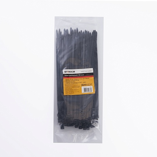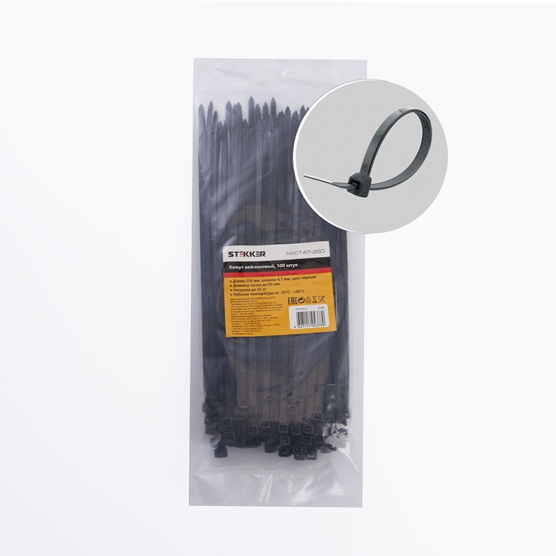 Характеристики Хомут нейлоновый STEKKER NYCT47-250 4,7х250 мм, d пучка max 65 мм, нагрузка 22кг, черный, упаковка 100 шт