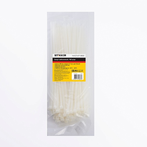Характеристики Хомут нейлоновый STEKKER NYCT47-300 4,7х300 мм, d пучка max 82 мм, нагрузка 22кг, белый, упаковка 100 шт