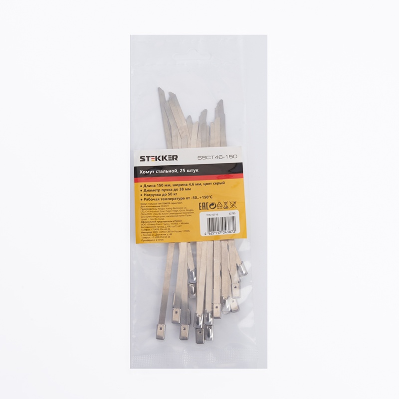 Характеристики Хомут стальной STEKKER SSCT46-150 4,6х150мм, d пучка max 38мм, нагрузка 50кг, серый, упаковка 25 шт