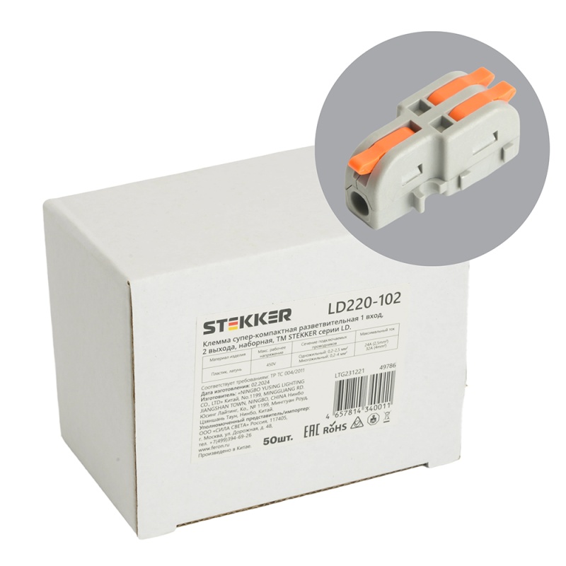 Клемма супер-компактная разветвительная 1 вход, 2 выхода, наборная STEKKER,LD220-102 49786