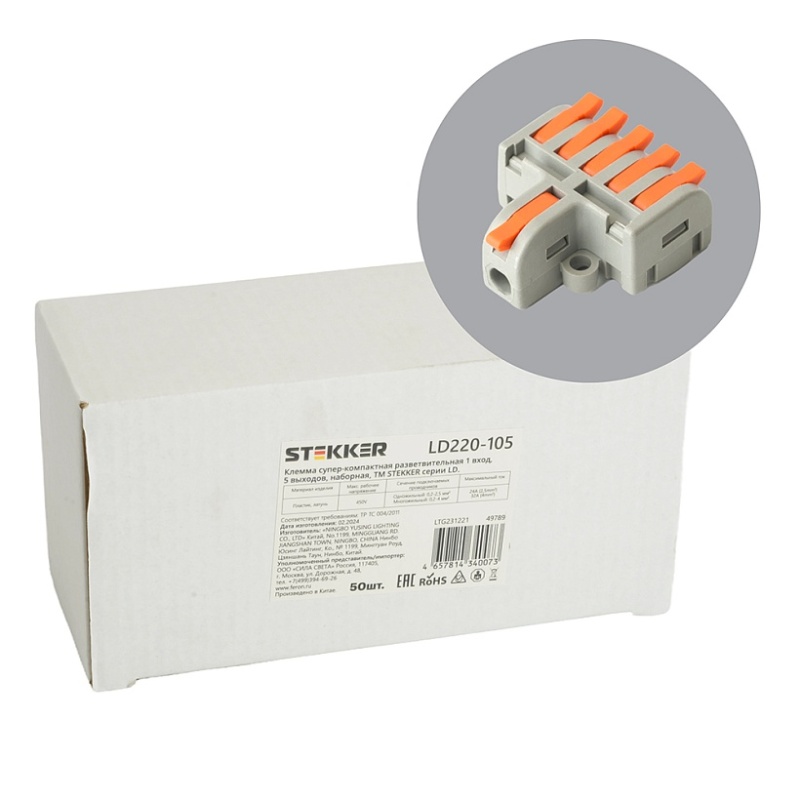 Характеристики Клемма супер-компактная разветвительная 1 вход, 4 выхода, наборная STEKKER,LD220-104