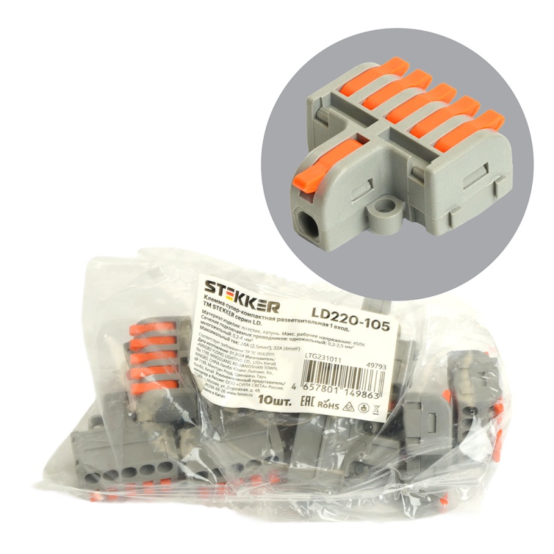 Характеристики Клемма супер-компактная разветвительная 1 вход, 5 выходов, наборная STEKKER,LD220-105 (DIY упак 10 шт)