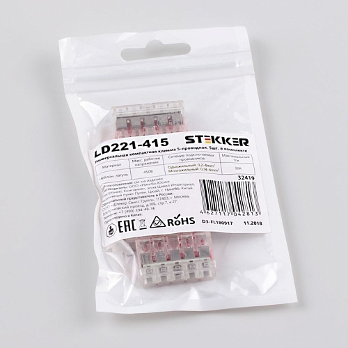 Универсальная компактная клемма 5-проводная STEKKER, LD221-415 (5 штук в упаковке) 32419