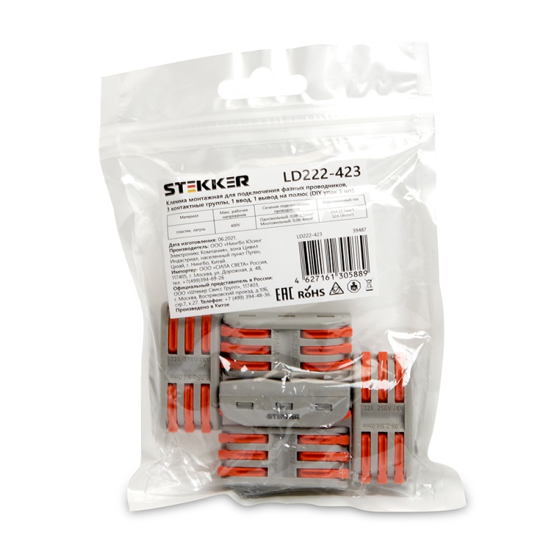 Клемма монтажная д/ подкл. фазн. проводников STEKKER, LD222-423, 3 контактные группы, 1ввод,1вывод на полюс (DIY упак 5 шт)