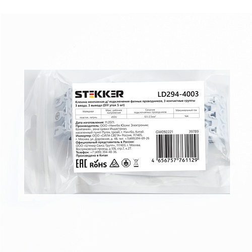 Характеристики Клемма монтажная STEKKER, LD294-4003, для подключения фазных проводников, 3 контактные группы (3 ввода, 3 вывода на полюс)