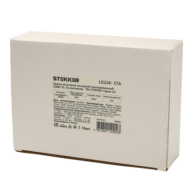 Характеристики Зажим винтовой концевой изолированный КЗВИ-10 500В, 57А, 10 контактов, поликарбонат LD228-57А
