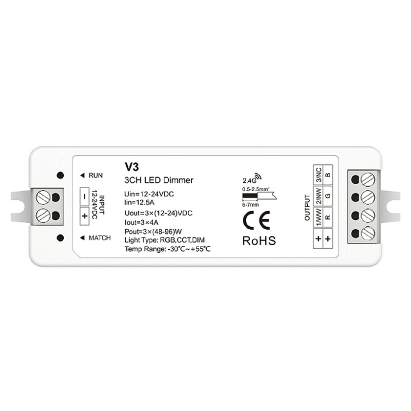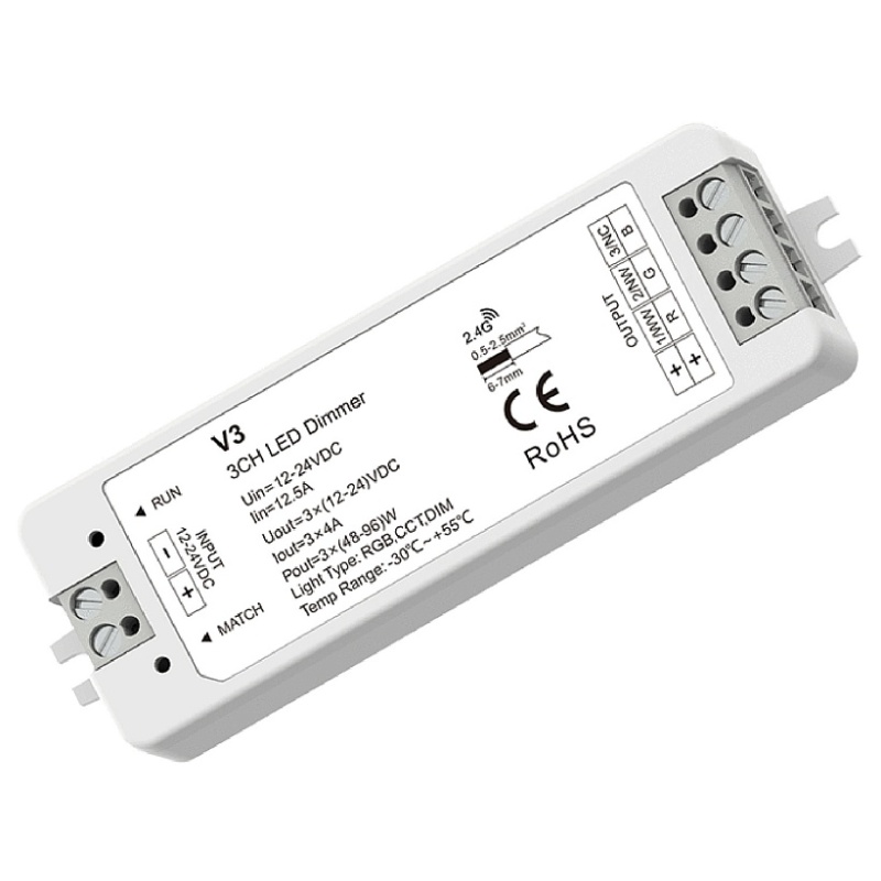 Пластик, 4 канала контроллер для RGB ленты; Может диммировать и управлять RGB
