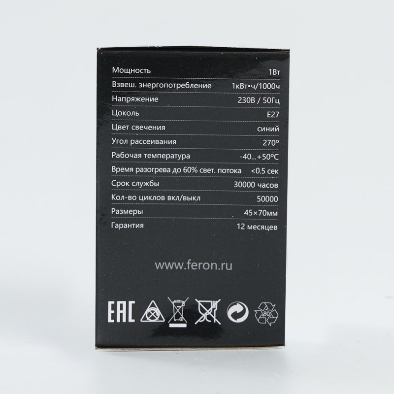 Характеристики Лампа светодиодная Feron LB-37 Шарик E27 1W 230V Синий