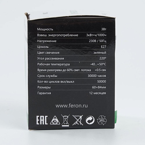 Характеристики Лампа светодиодная Feron LB-371 Шар E27 3W 230V зеленый
