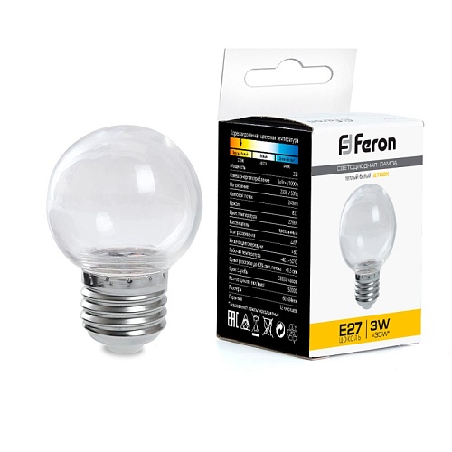Характеристики Лампа светодиодная Feron LB-371 Шар E27 3W 230V 2700K прозрачный
