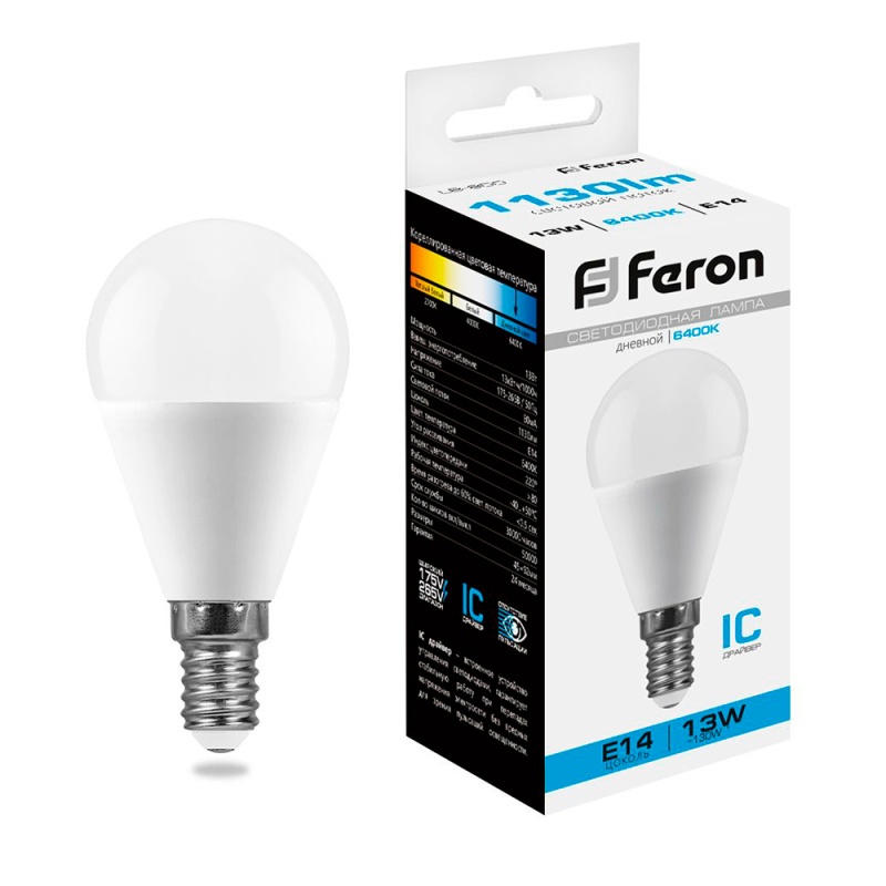 Характеристики Лампа светодиодная Feron LB-950 Шарик E14 13W 175-265V 6400K