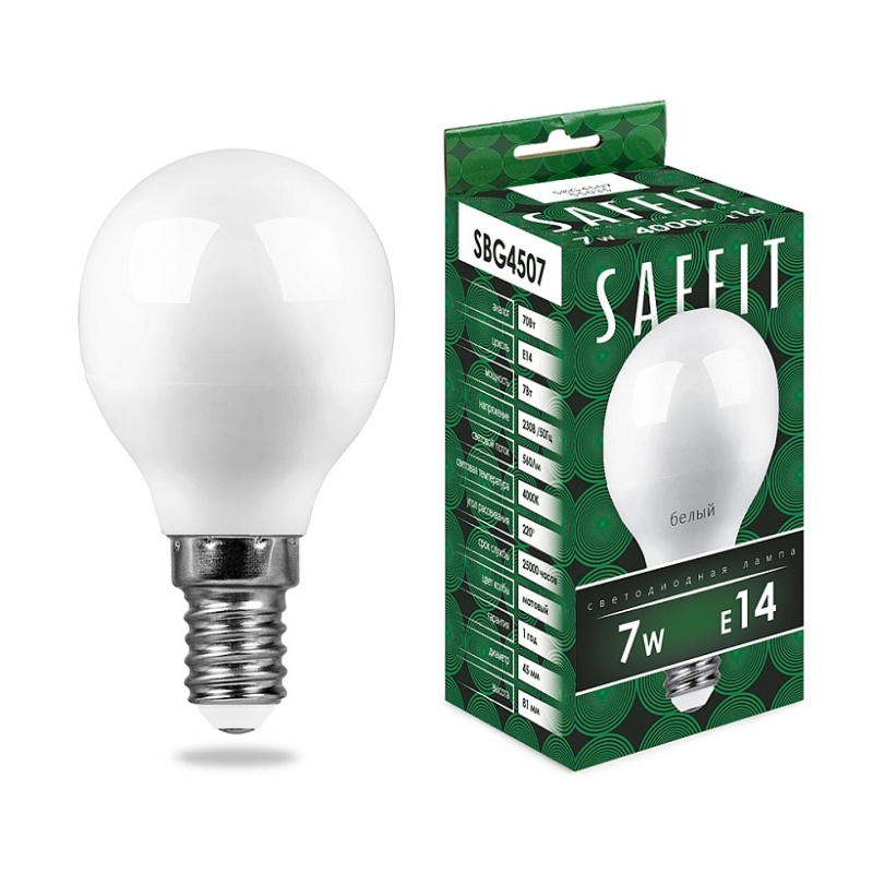 Характеристики Лампа светодиодная SAFFIT SBG4507 Шарик E14 7W 230V 4000K