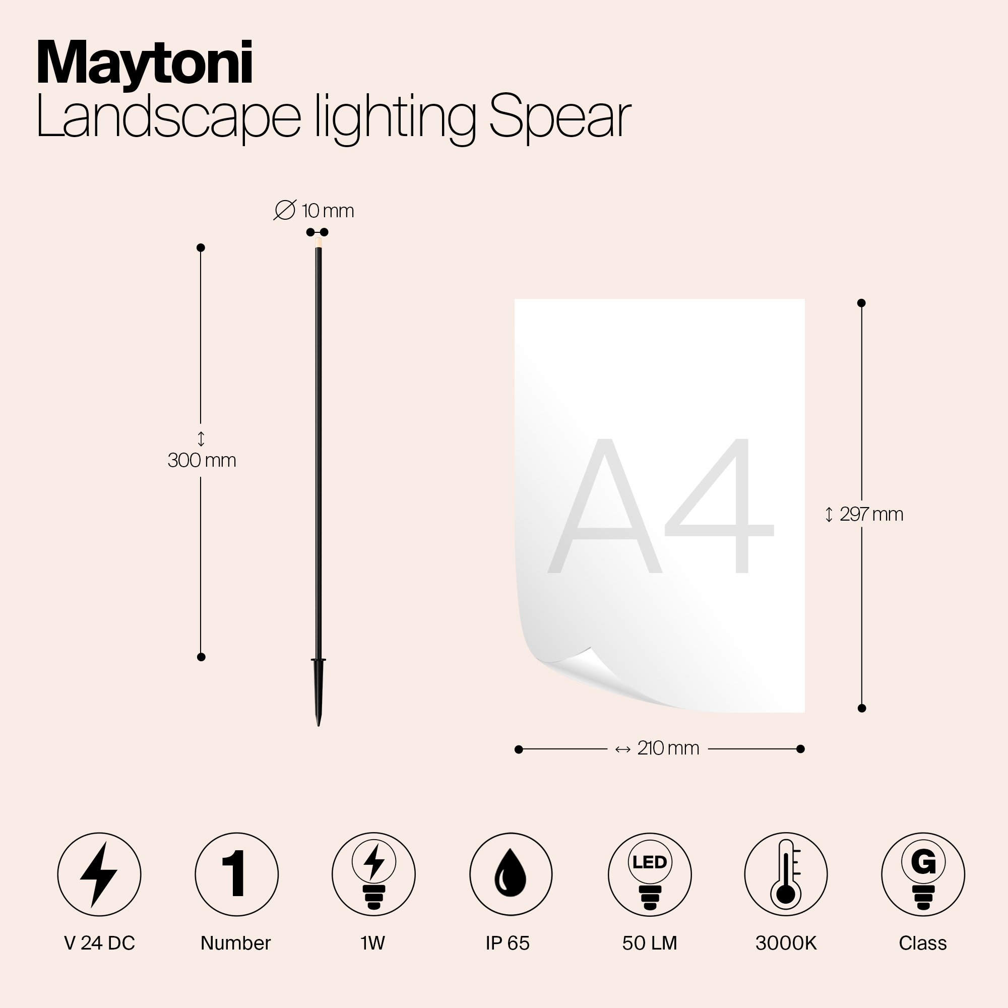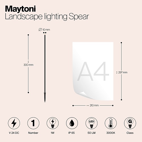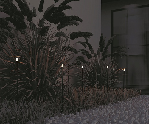 Металлический корпус, цвет - графит. Белый акриловый рассеиватель. Узкий цилиндрический светильник для подсветки растительных насаждений - цветов, кустарников, деревьев, газонов. Установка в грунт. Возможность подключения нескольких светильников к одному источнику питания. LED-источник света, цветовая температура - 3000К. Степень защиты - IP65. Питание 24В.