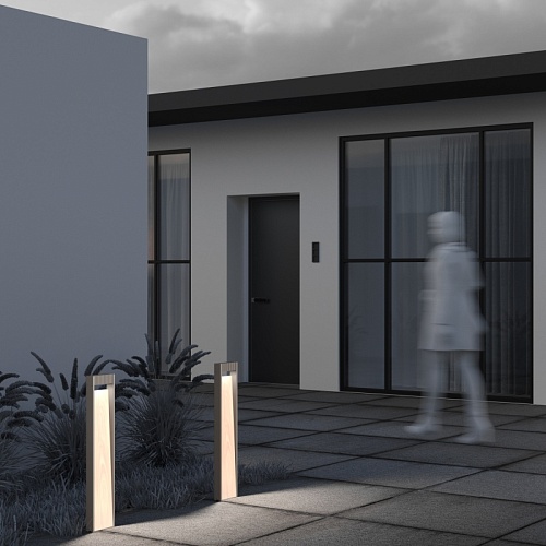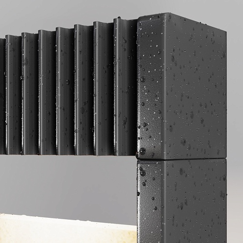 Материал корпуса - алюминий, цвет - графит. Два варианта декоративной поверхности корпуса - рифленый металл и имитация дерева. LED-источник света, цветовая температура - 3000К. Высокая степень защиты - IP65.